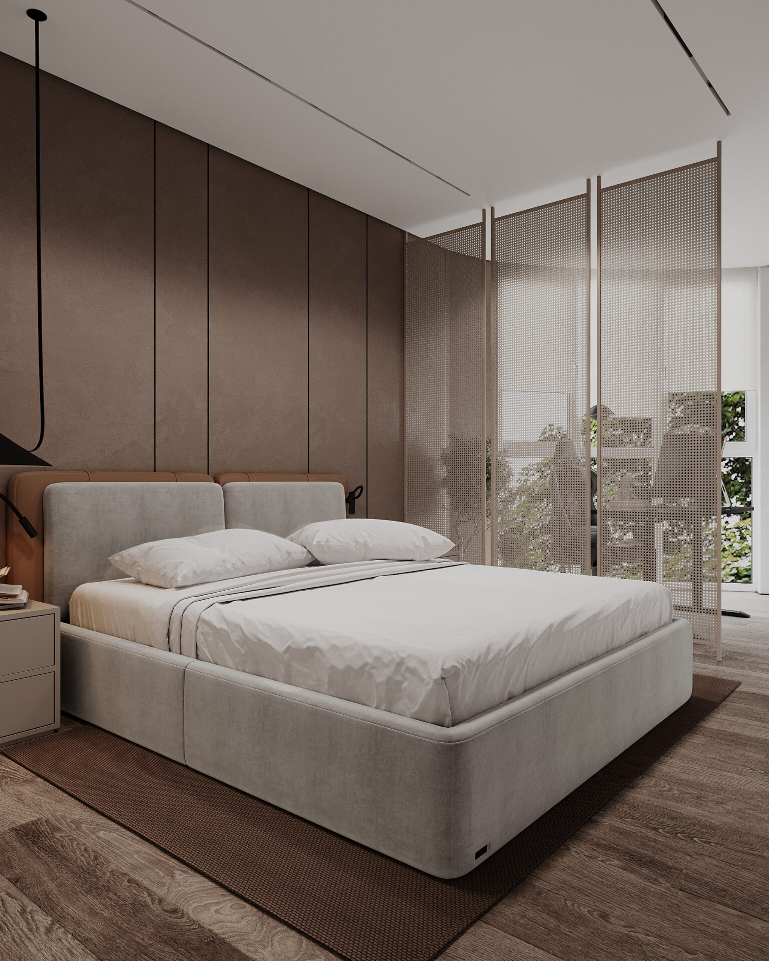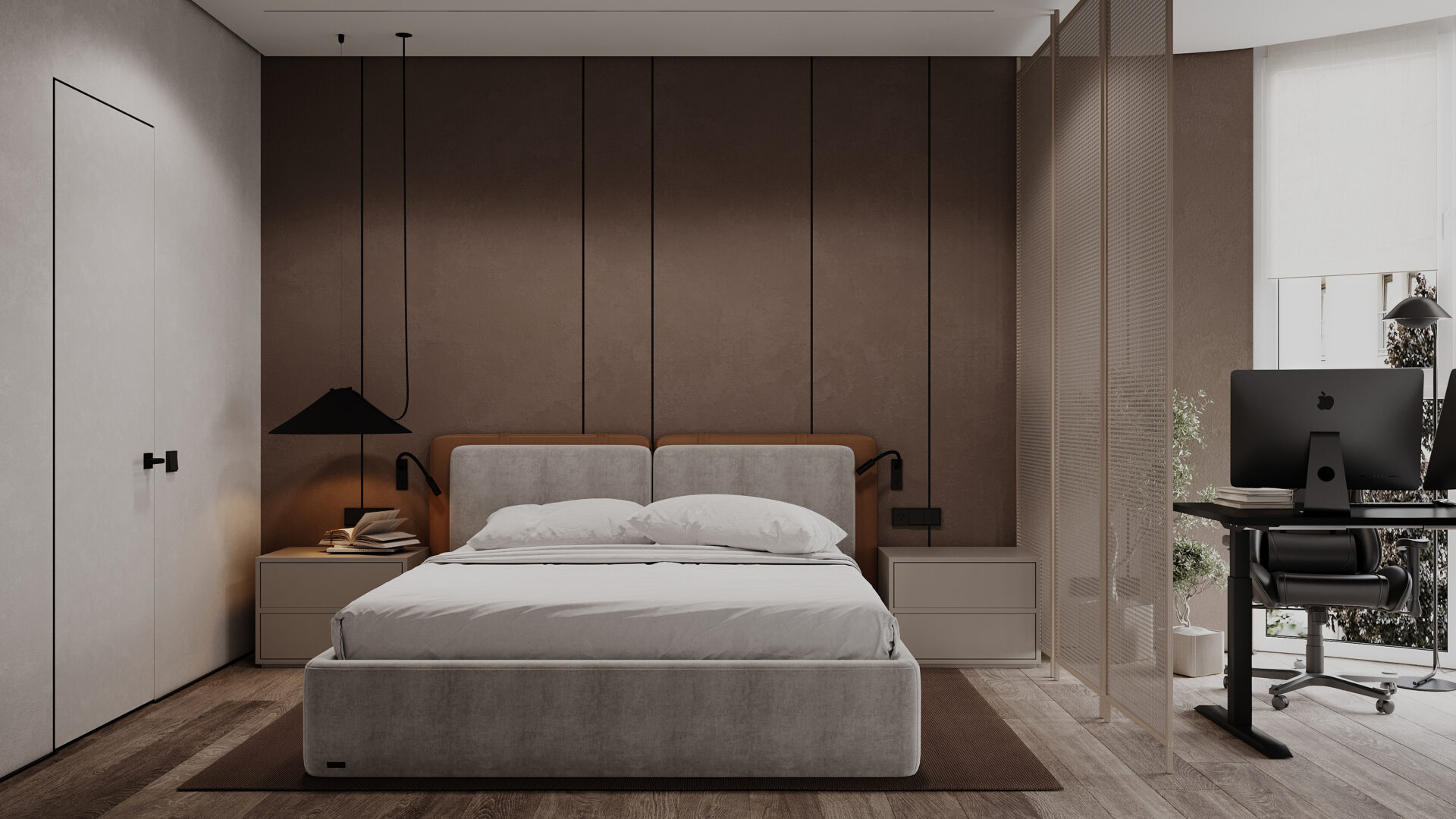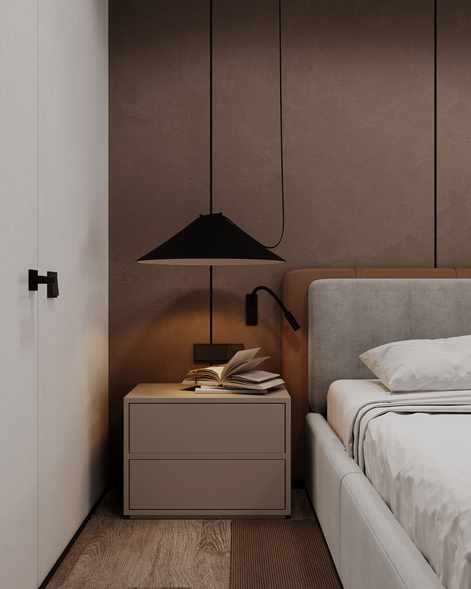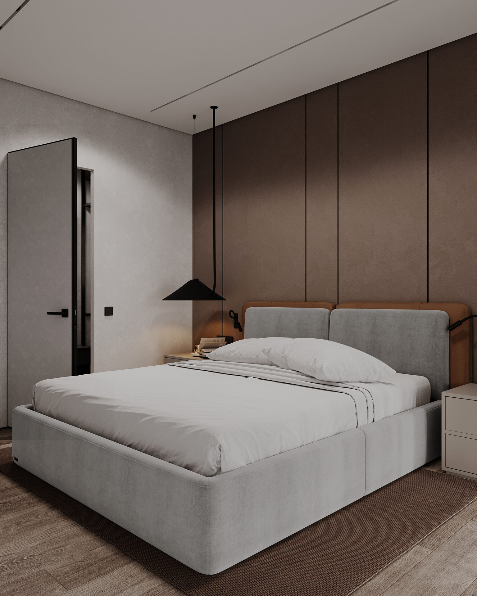 Квартира в сучасному стилі з яскравими акцентами. Об’єднані кухня-вітальня створюють простір, а два санвузли забезпечують комфорт. Поєднання сірих відтінків із теракотовими деталями виглядає стильно та гармонійно. Особливу увагу привертає імітація стіни під скелю, яка додає інтер’єру виразності та унікальності.