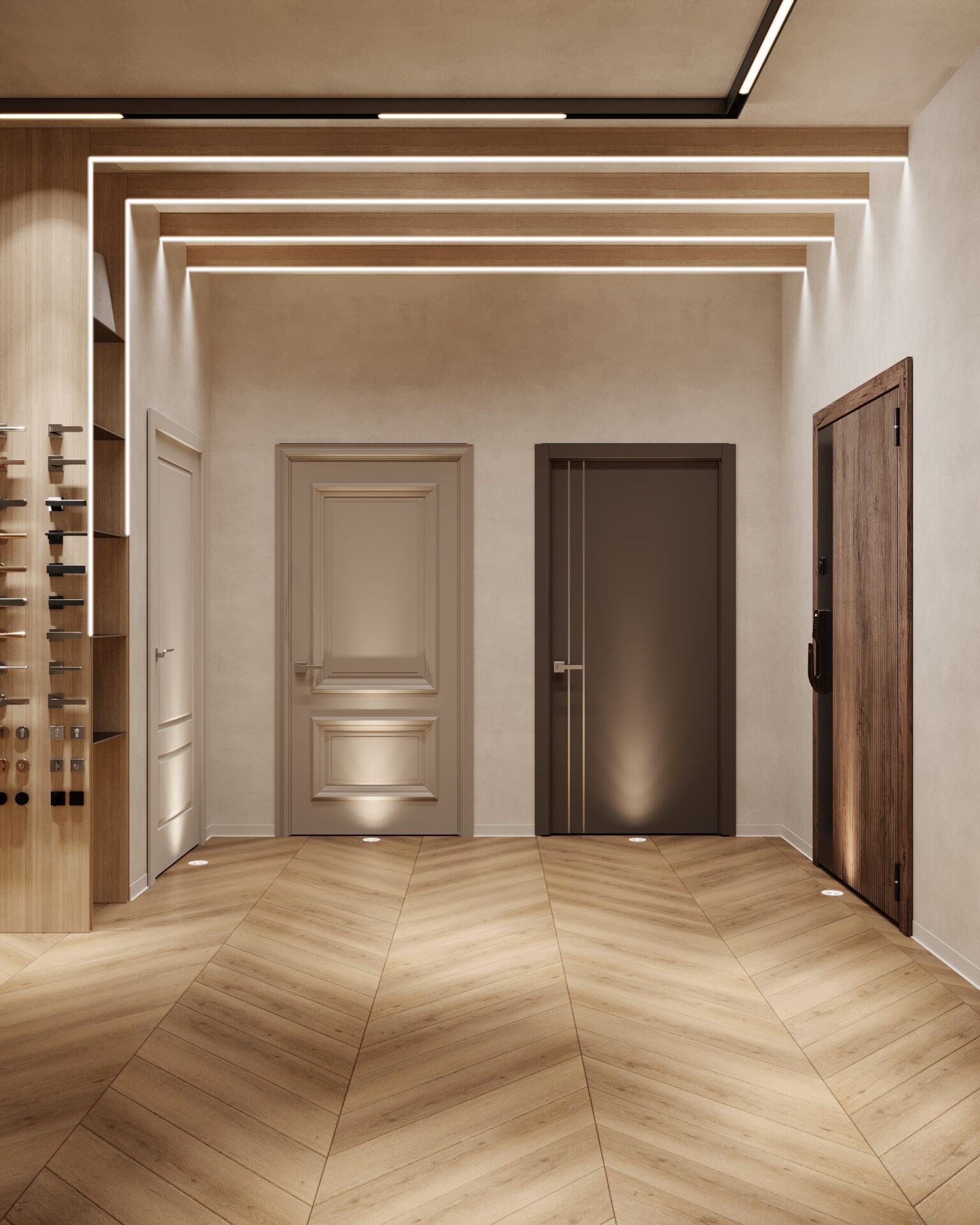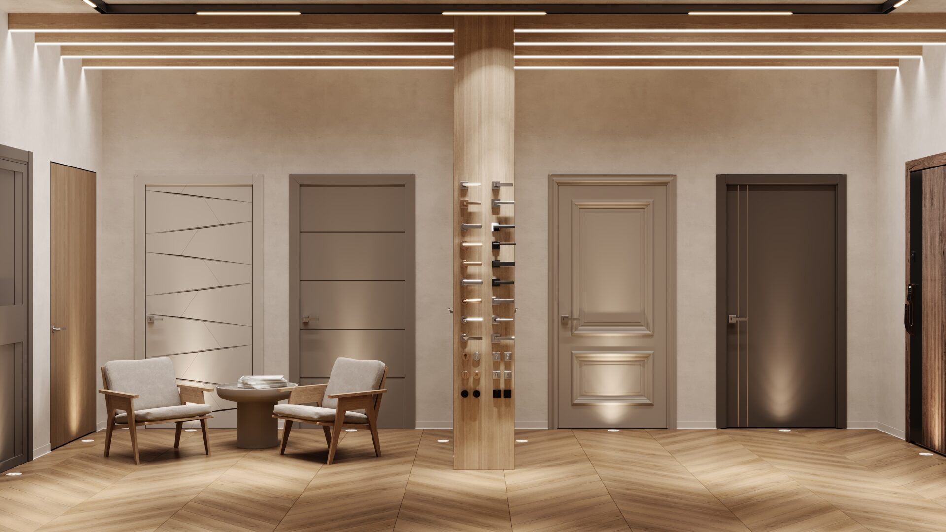 Комерційний проєкт салону дверей, що поєднує функціональність і стиль. Простір розроблено так, щоб передавати серйозність і створювати комфорт для клієнтів. У проєкті передбачено дитячу зону, виставкову зону, кухню та кабінети. Ми врахували всі деталі для зручності та ефективності роботи, поєднавши це з сучасними інтер’єрними рішеннями.