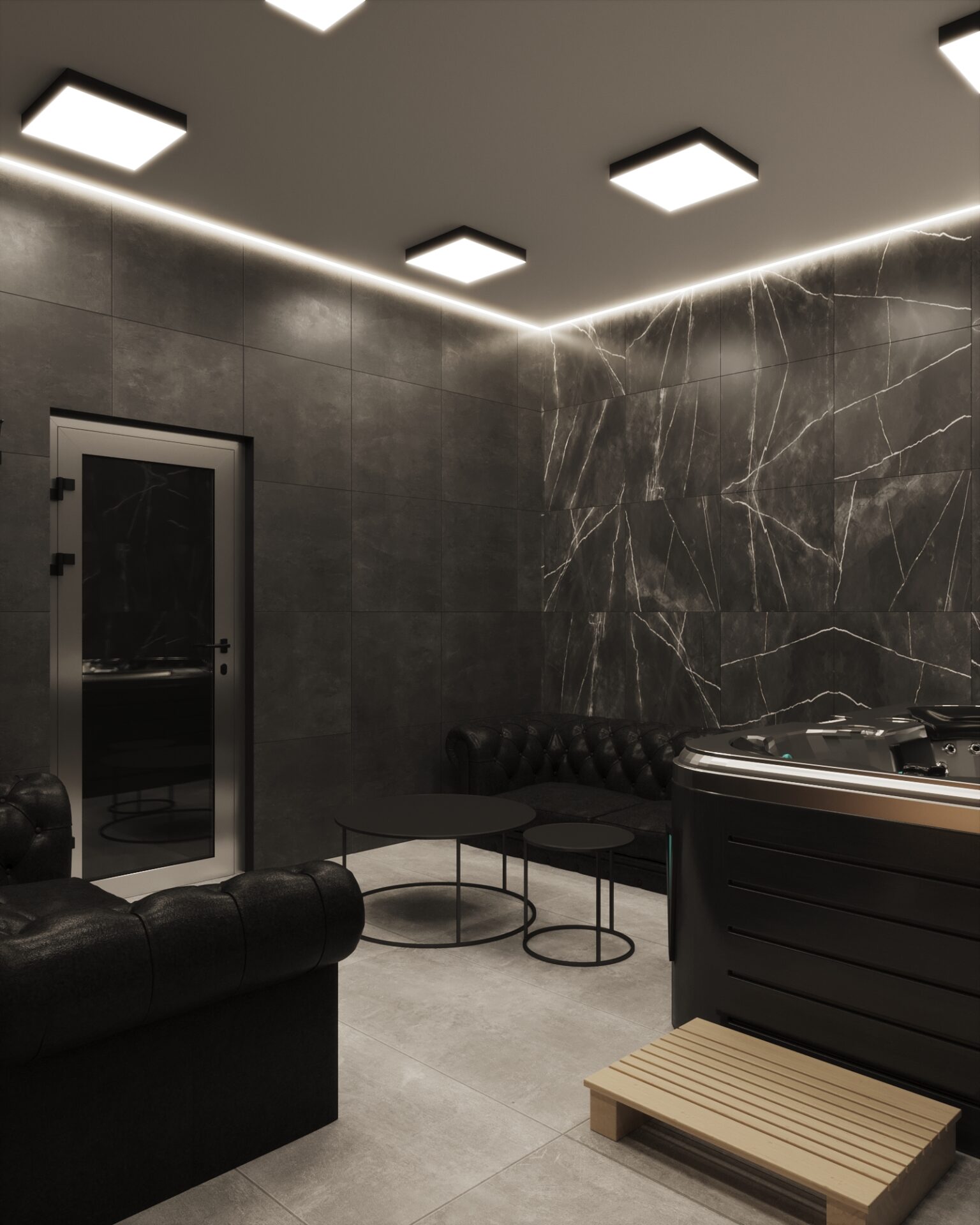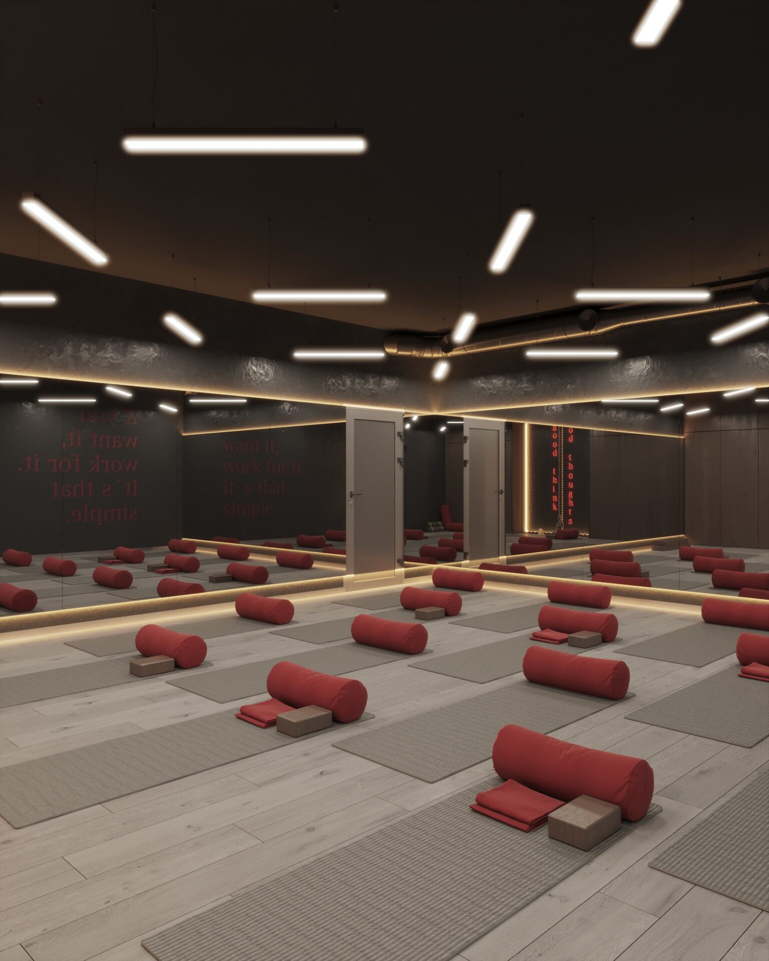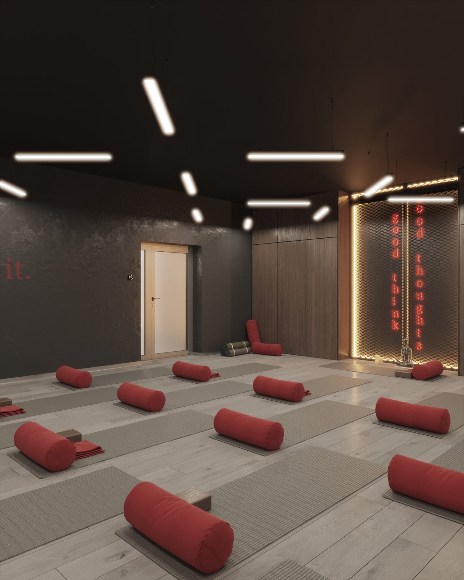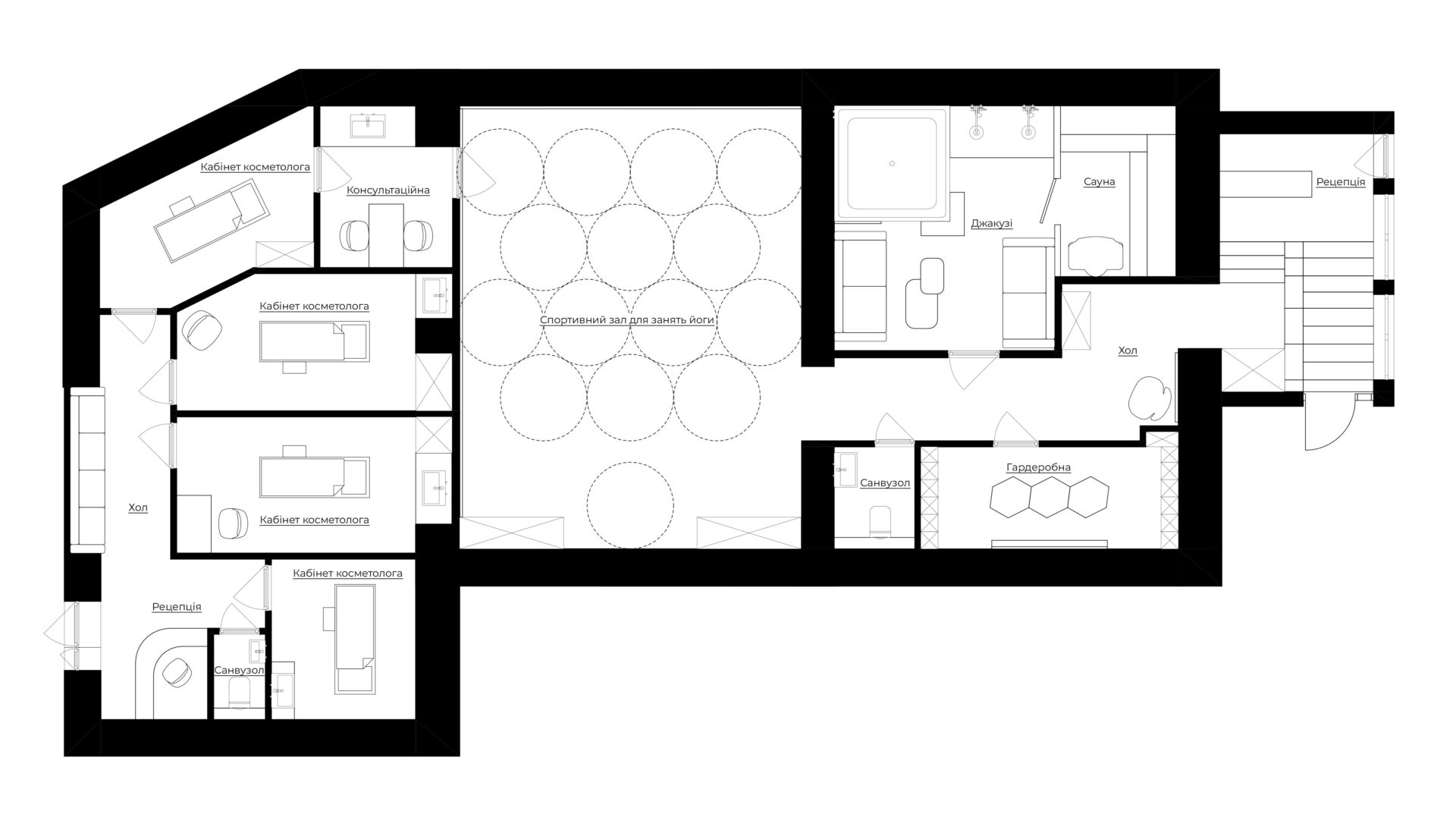 Мультифункціональний заклад на Івано-Франківщині, який об’єднує в собі кілька напрямків: спа, зал для занять йогою та косметологію. При проєктуванні у нас було два важливих завдання: уникнення глобальних перепланувань в силу технічних особливостей приміщення, а також використання в проєкті вже закуплених матеріалів.