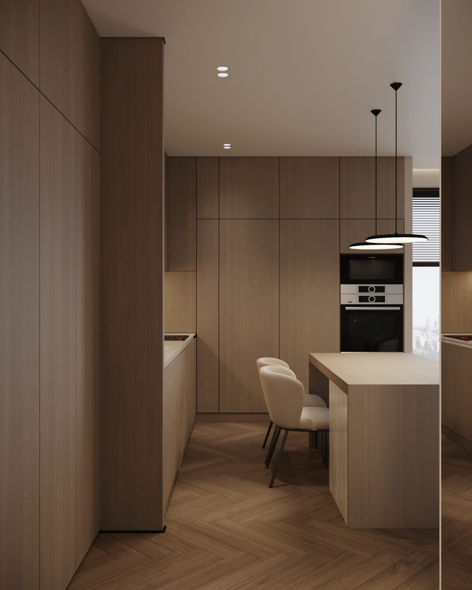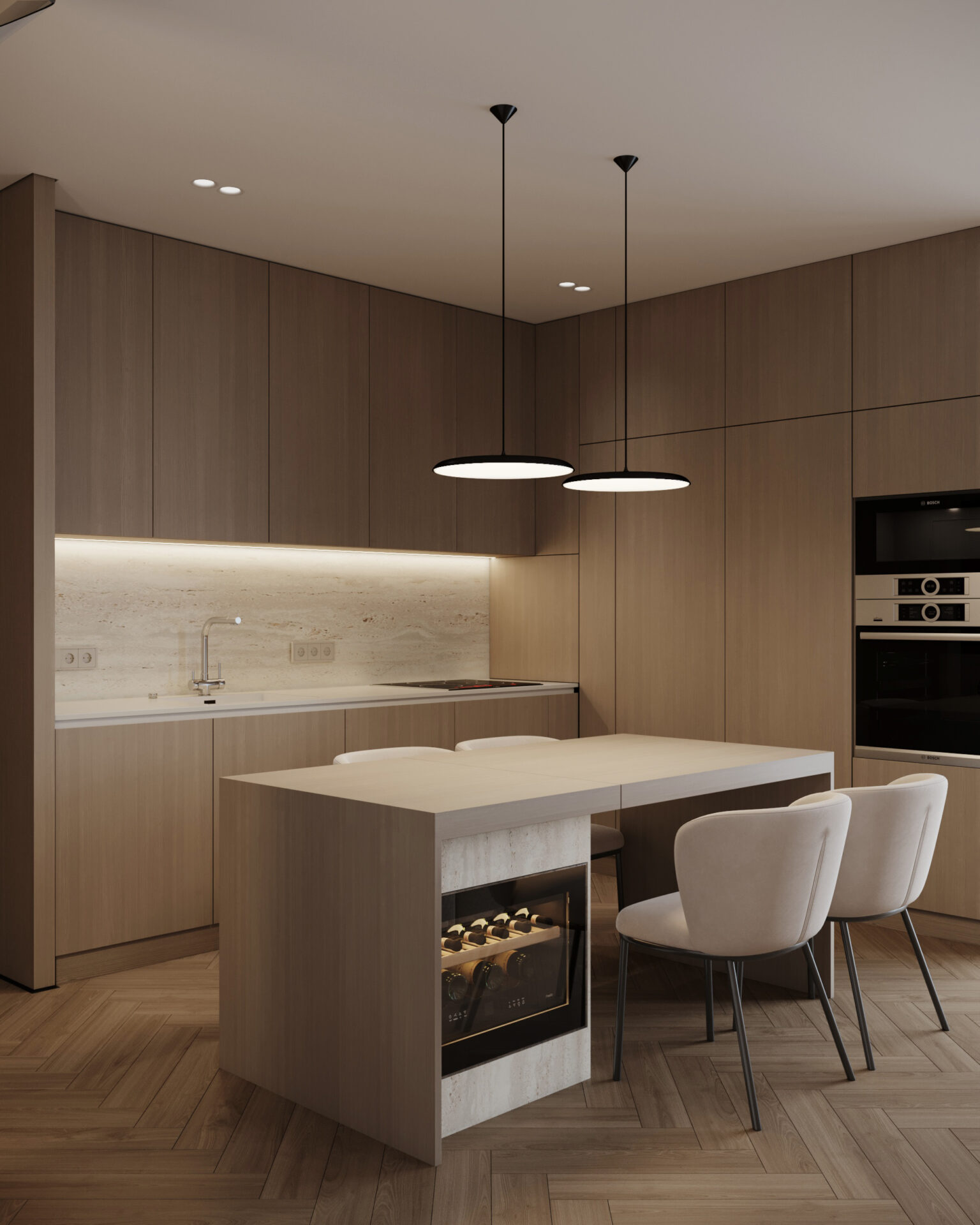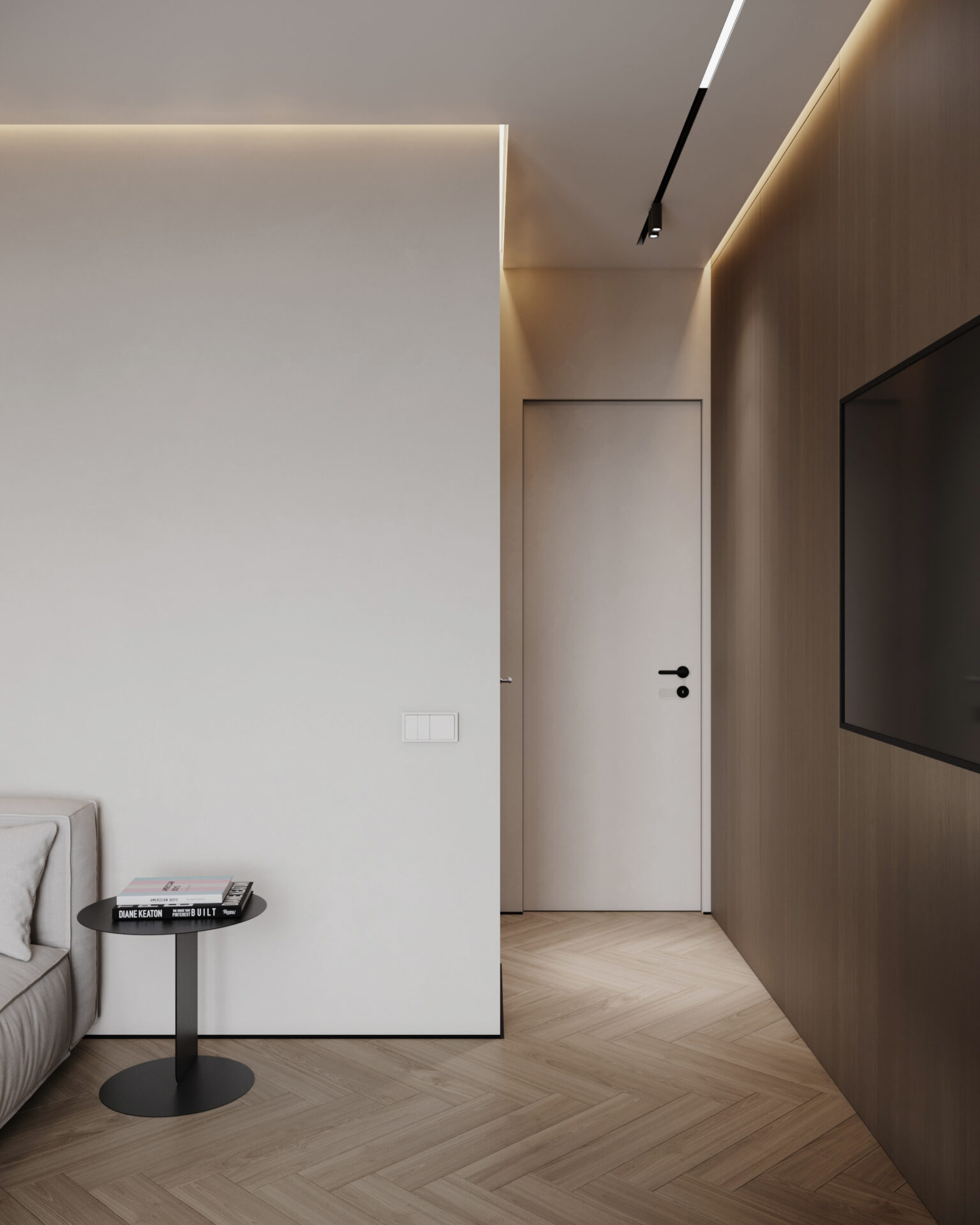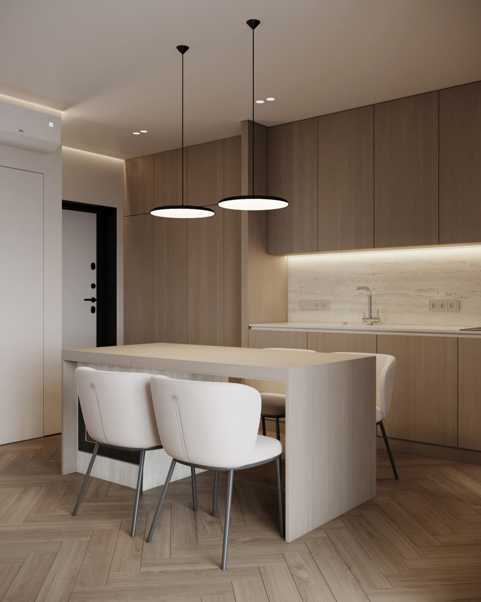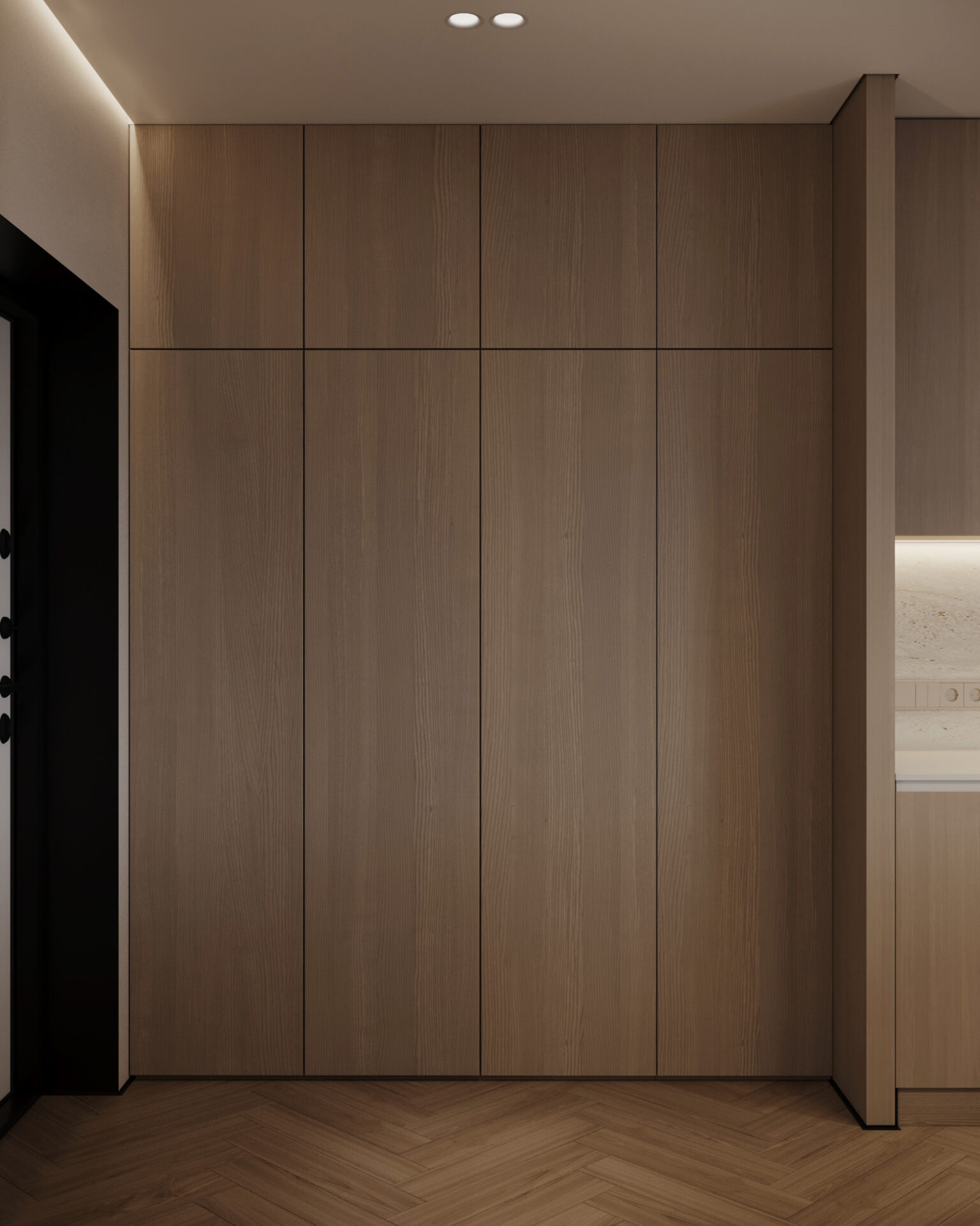 Проект для молодої дівчини, виконаний у мінімалістичному стилі. Ми поєднали світлі відтінки з деревом, створивши легкість і простір. Після перепланування у квартирі нам вдалося розмістити пральну кімнату, кабінет з гардеробною, спальню з проектором та винну шафу під обіднім столом у кухні. Комфорт та функціональність для сучасного життя.