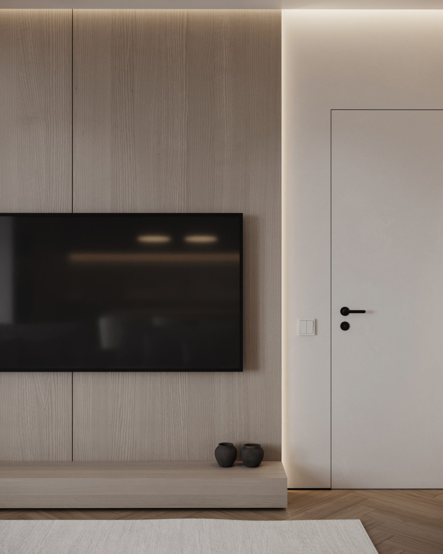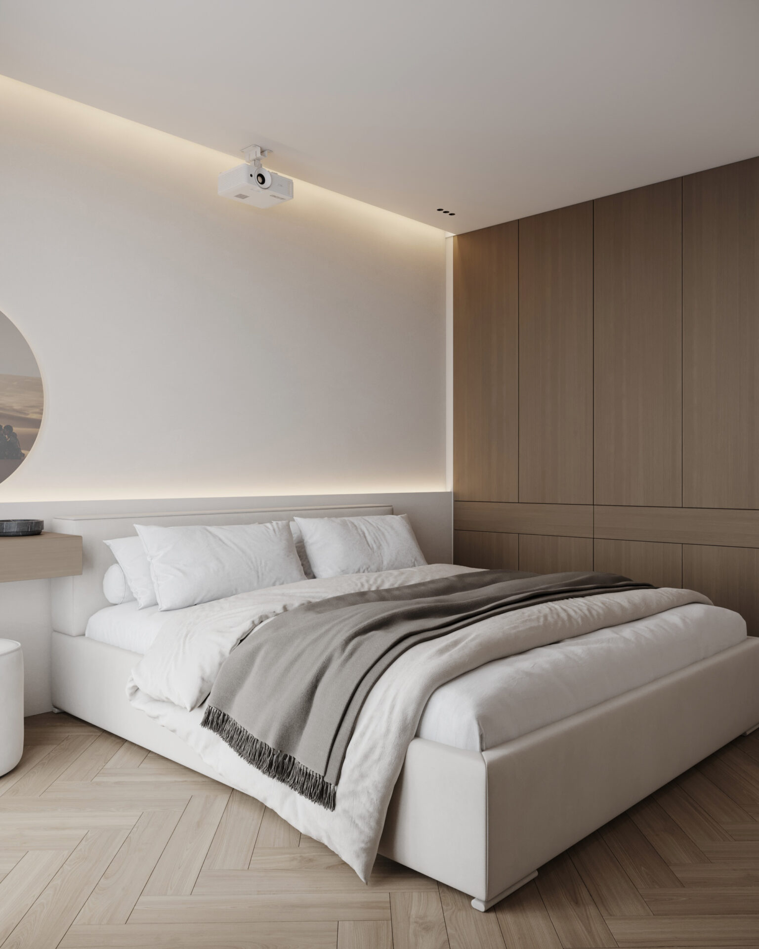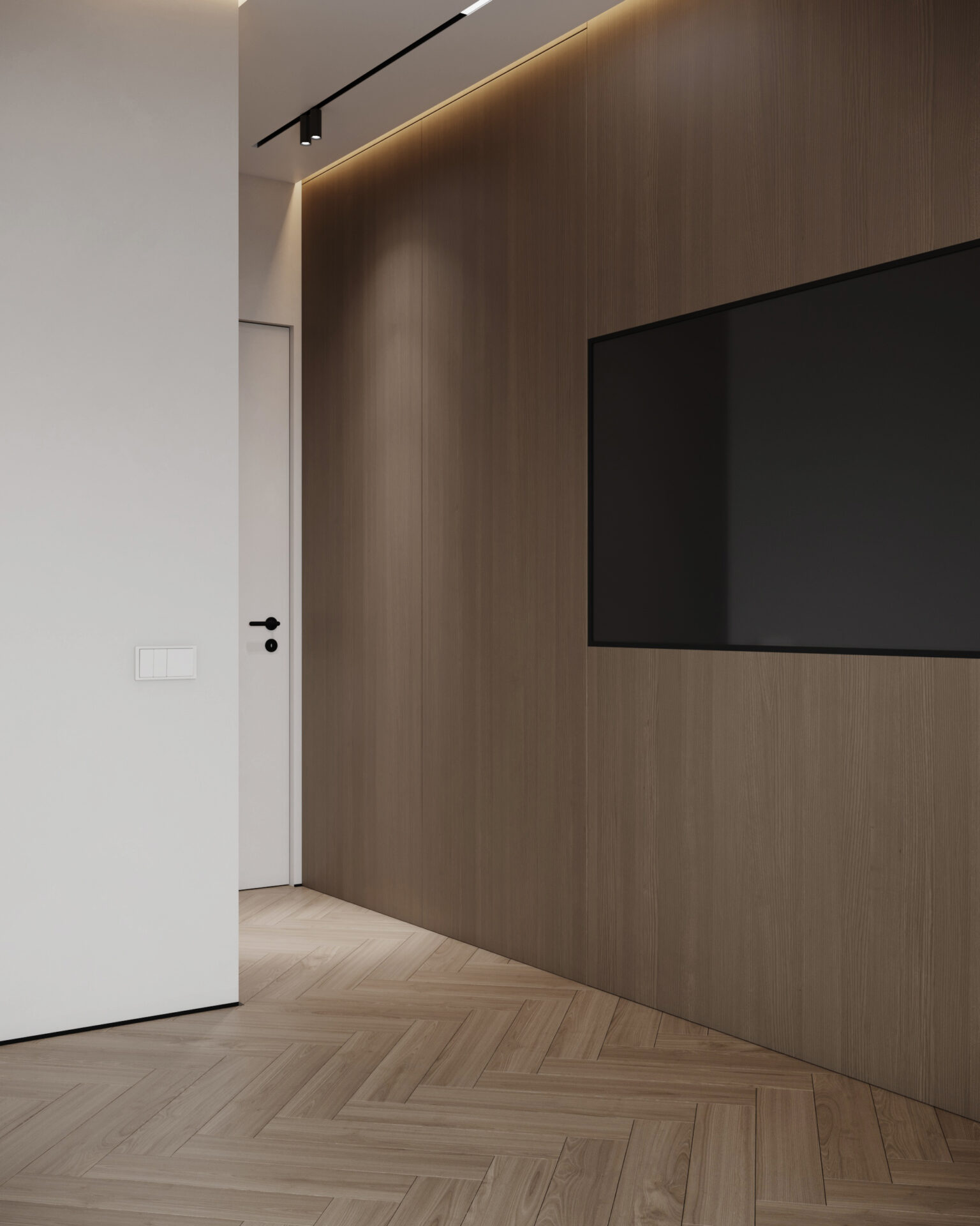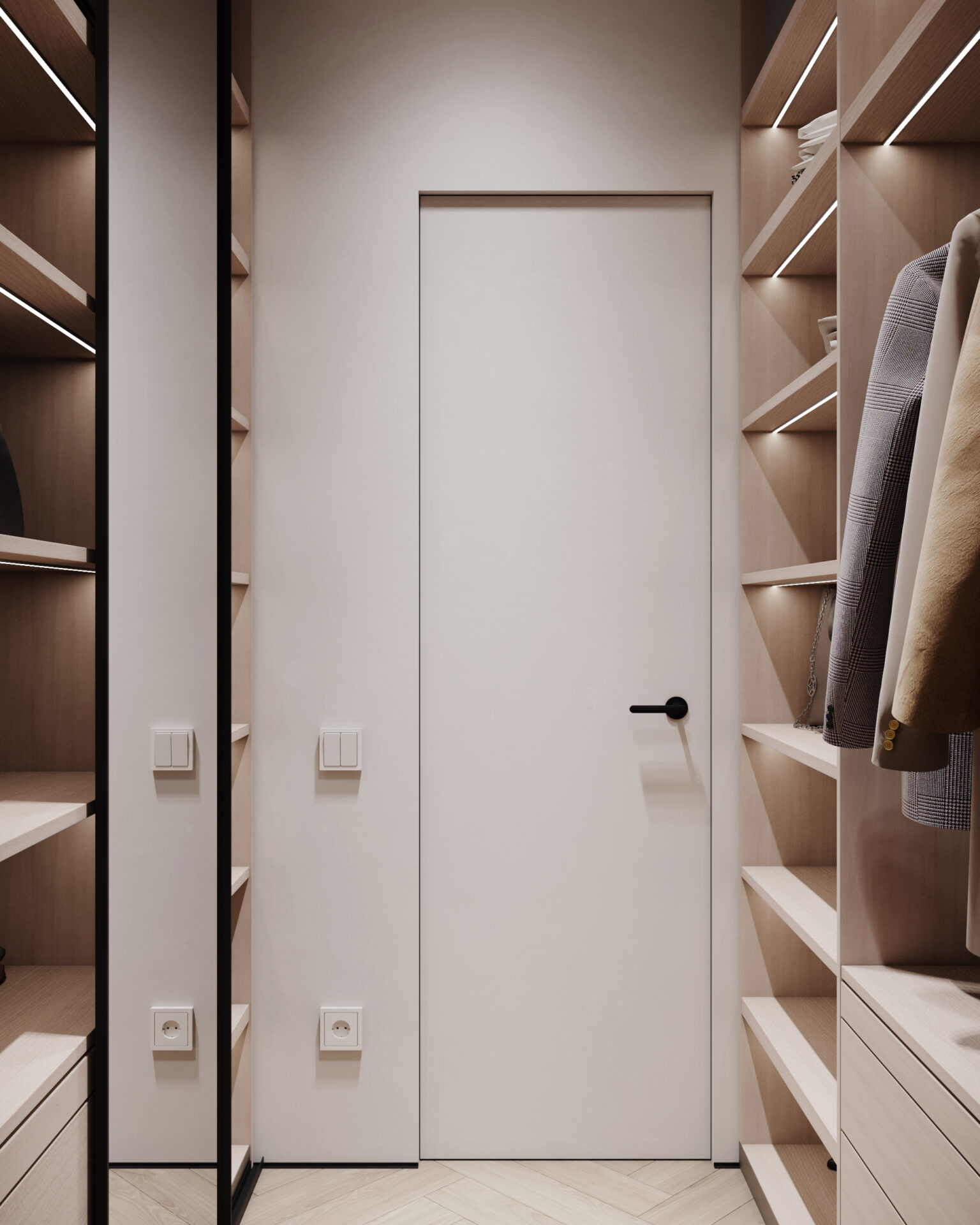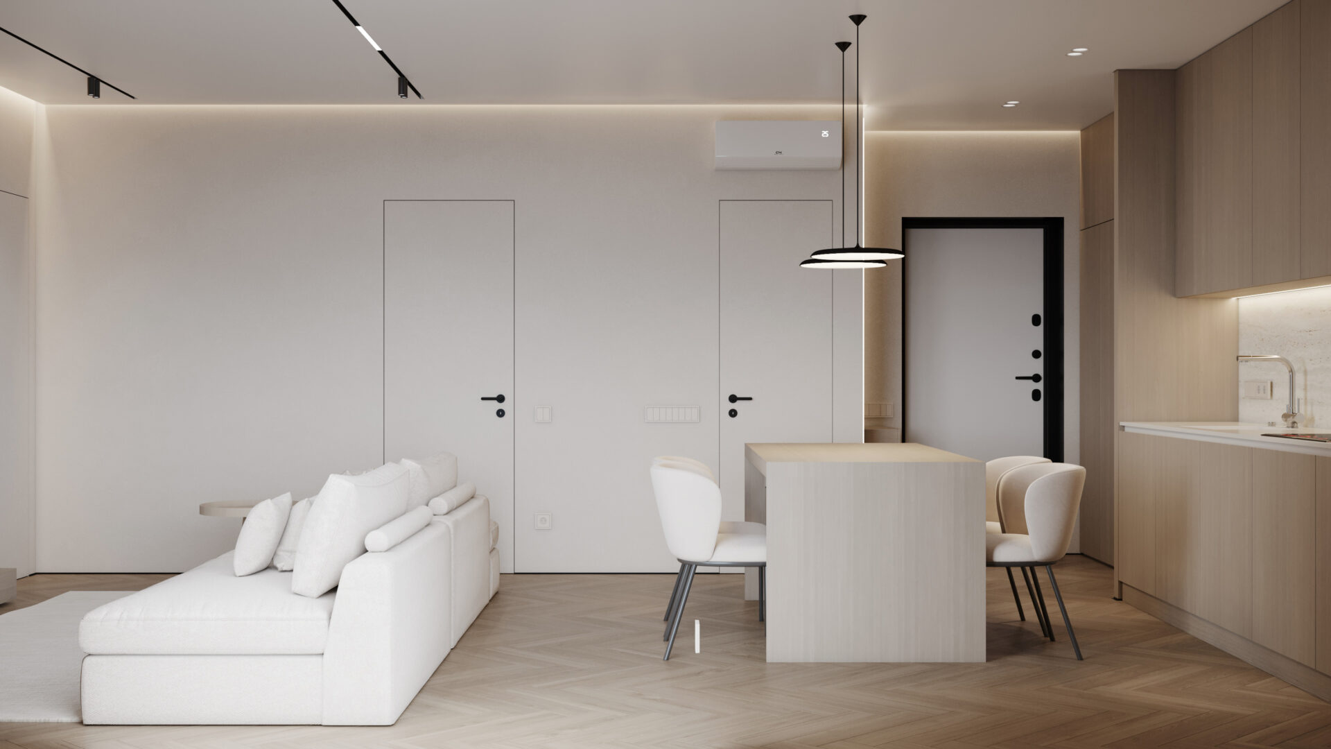 Проект для молодої дівчини, виконаний у мінімалістичному стилі. Ми поєднали світлі відтінки з деревом, створивши легкість і простір. Після перепланування у квартирі нам вдалося розмістити пральну кімнату, кабінет з гардеробною, спальню з проектором та винну шафу під обіднім столом у кухні. Комфорт та функціональність для сучасного життя.
