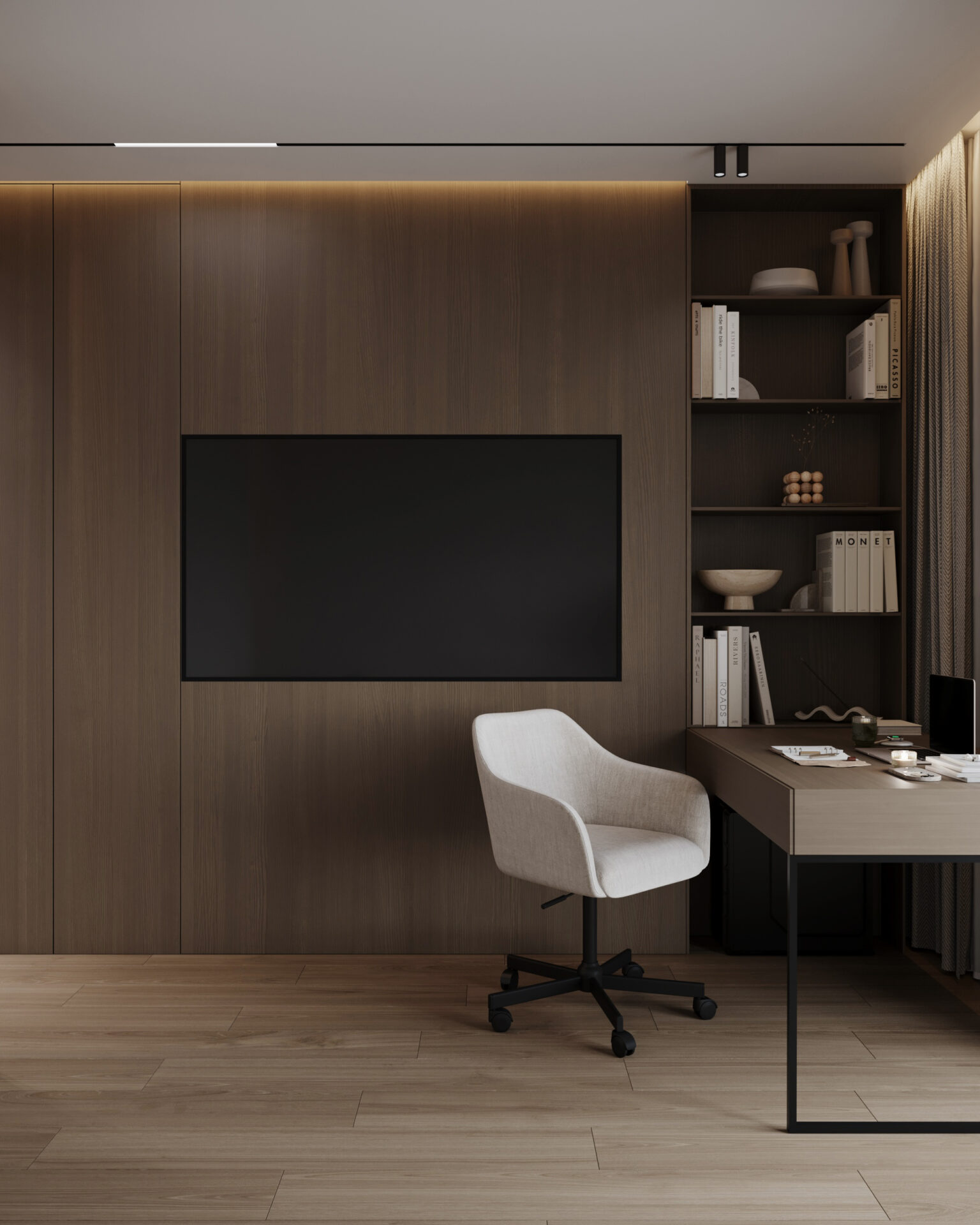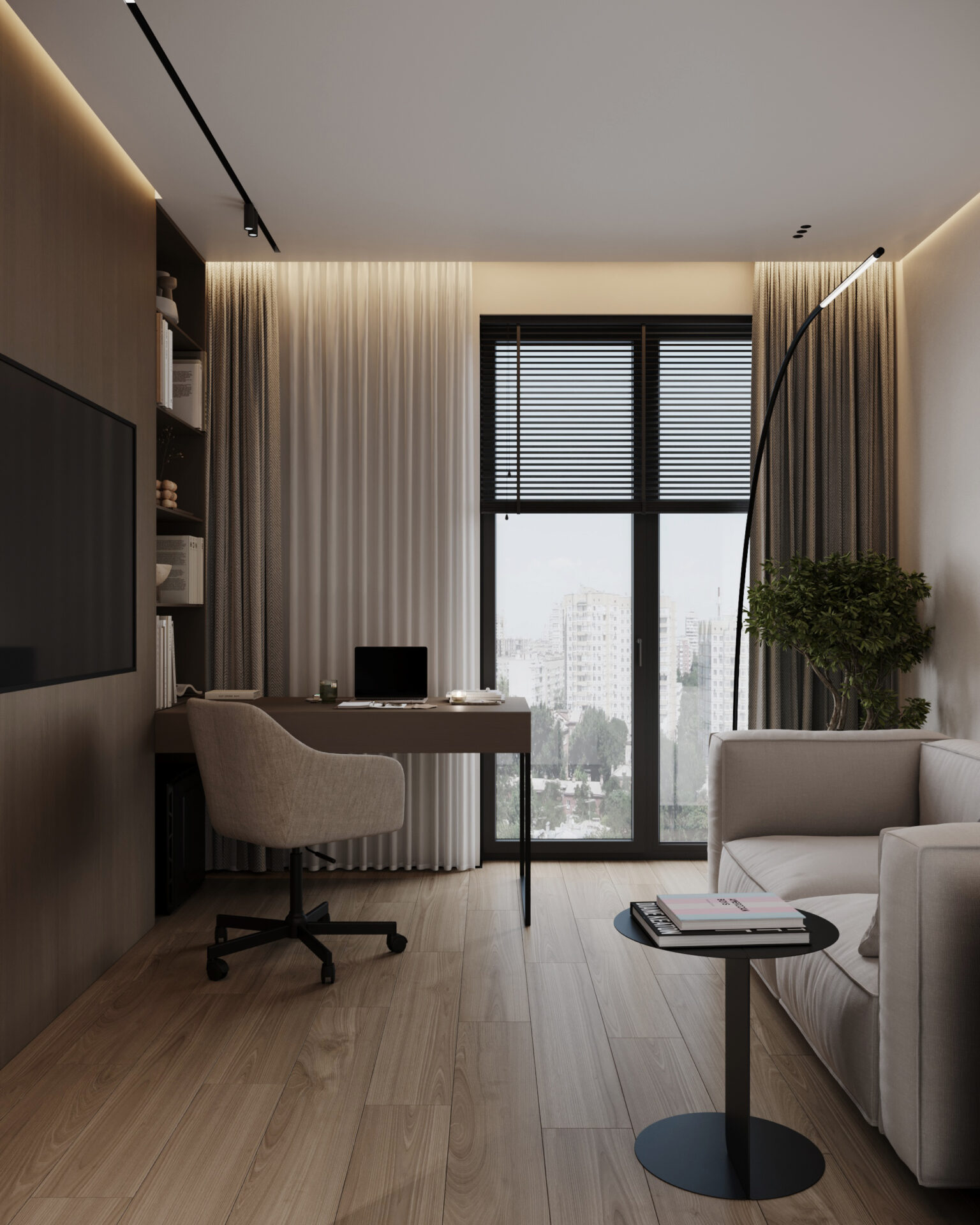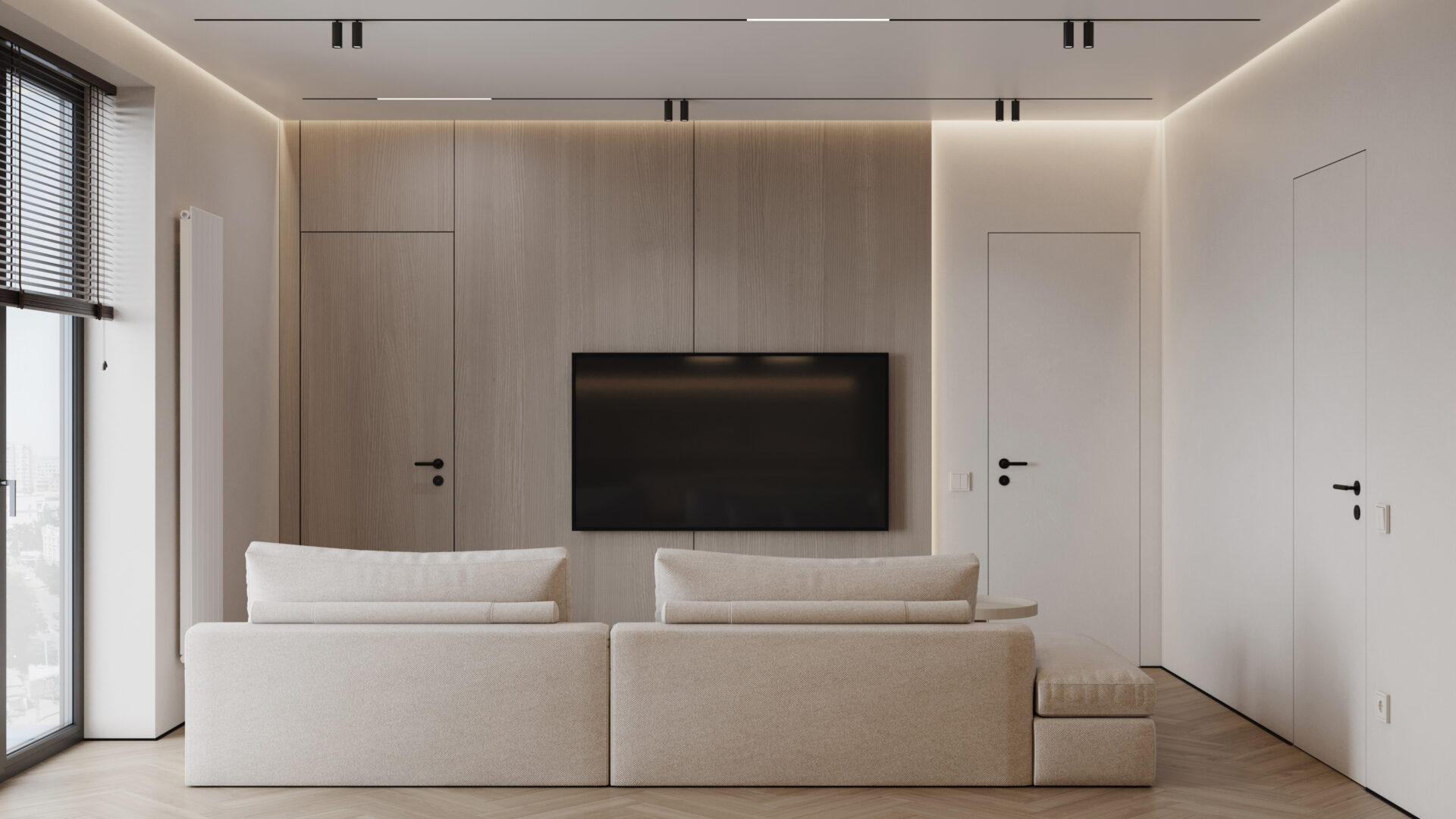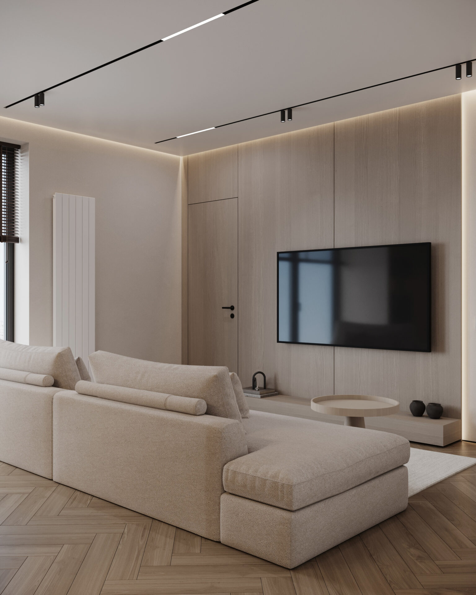 Проект для молодої дівчини, виконаний у мінімалістичному стилі. Ми поєднали світлі відтінки з деревом, створивши легкість і простір. Після перепланування у квартирі нам вдалося розмістити пральну кімнату, кабінет з гардеробною, спальню з проектором та винну шафу під обіднім столом у кухні. Комфорт та функціональність для сучасного життя.
