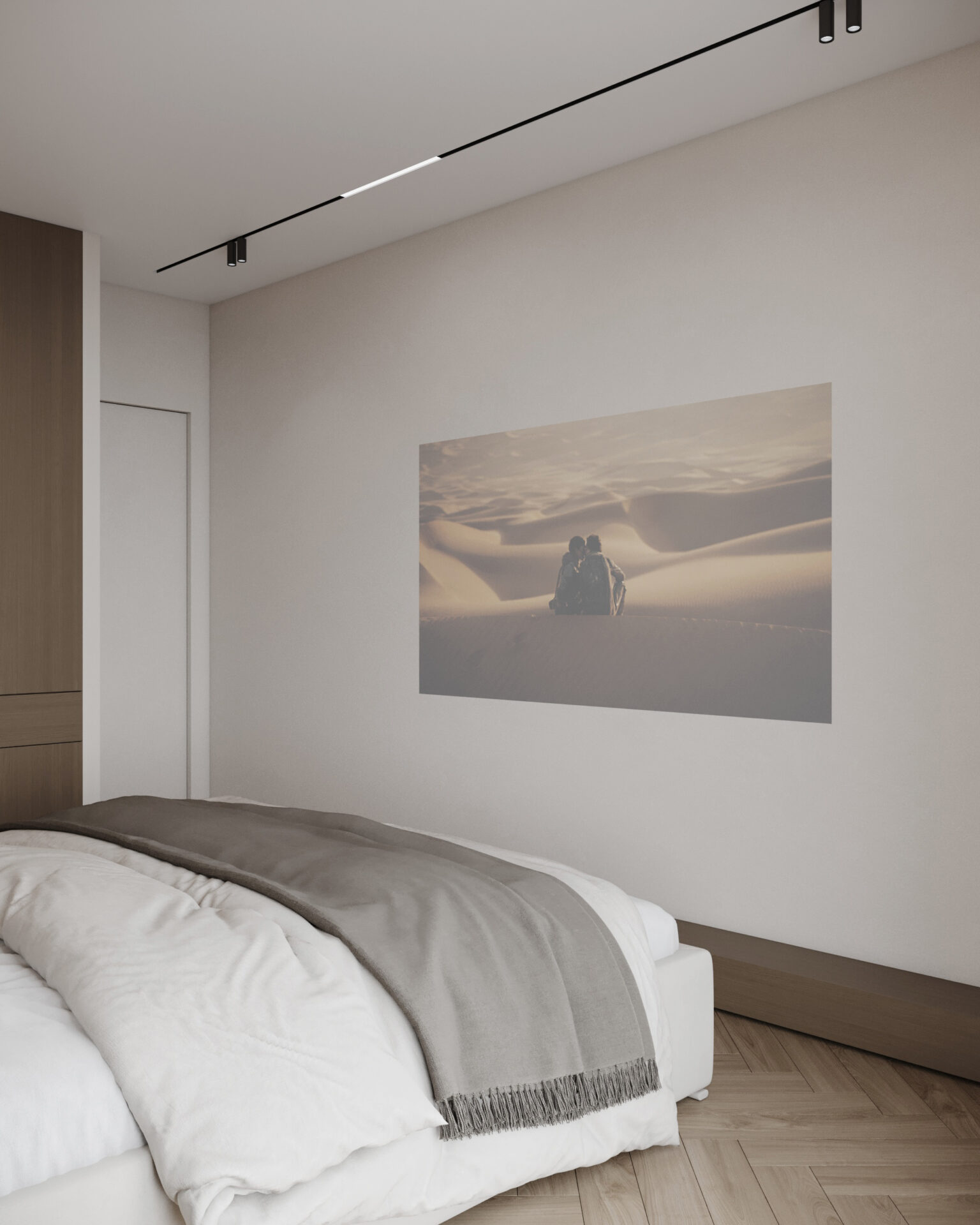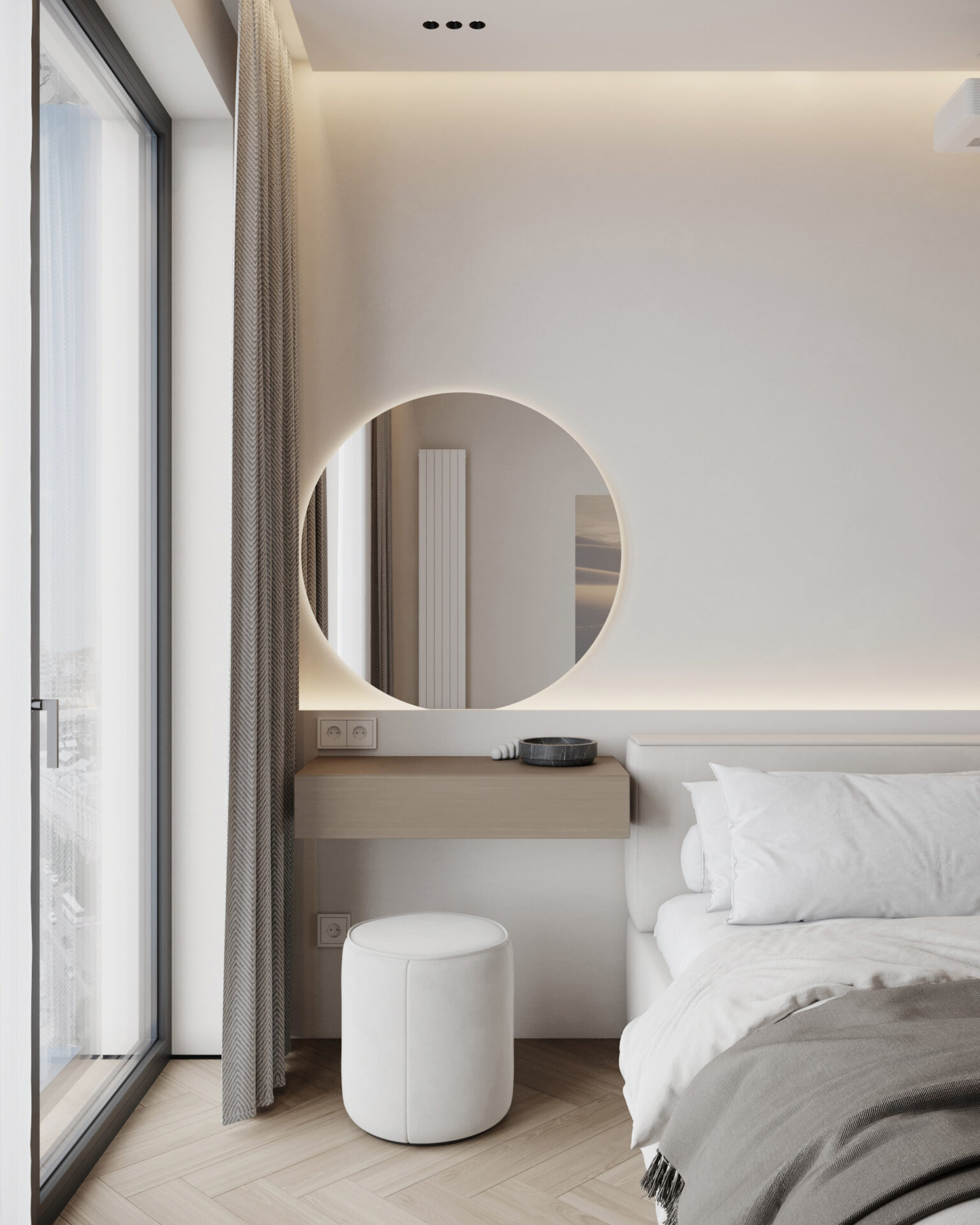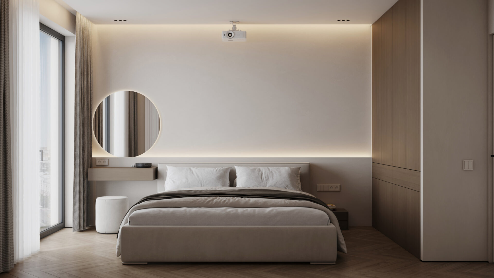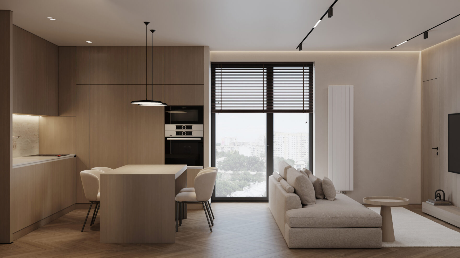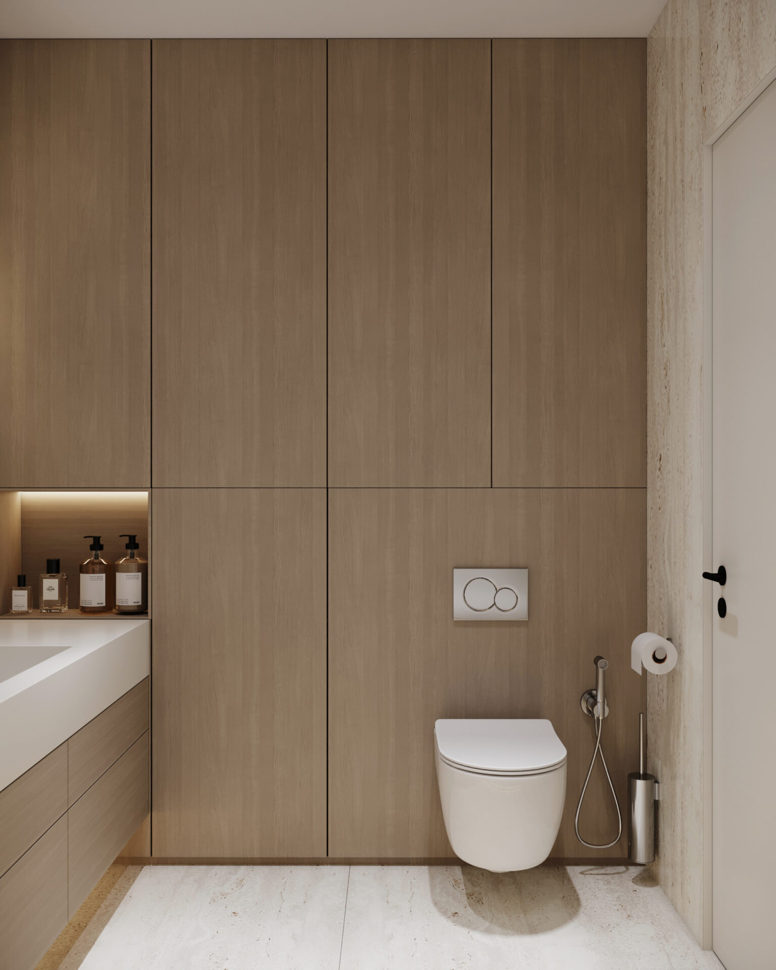 Проект для молодої дівчини, виконаний у мінімалістичному стилі. Ми поєднали світлі відтінки з деревом, створивши легкість і простір. Після перепланування у квартирі нам вдалося розмістити пральну кімнату, кабінет з гардеробною, спальню з проектором та винну шафу під обіднім столом у кухні. Комфорт та функціональність для сучасного життя.