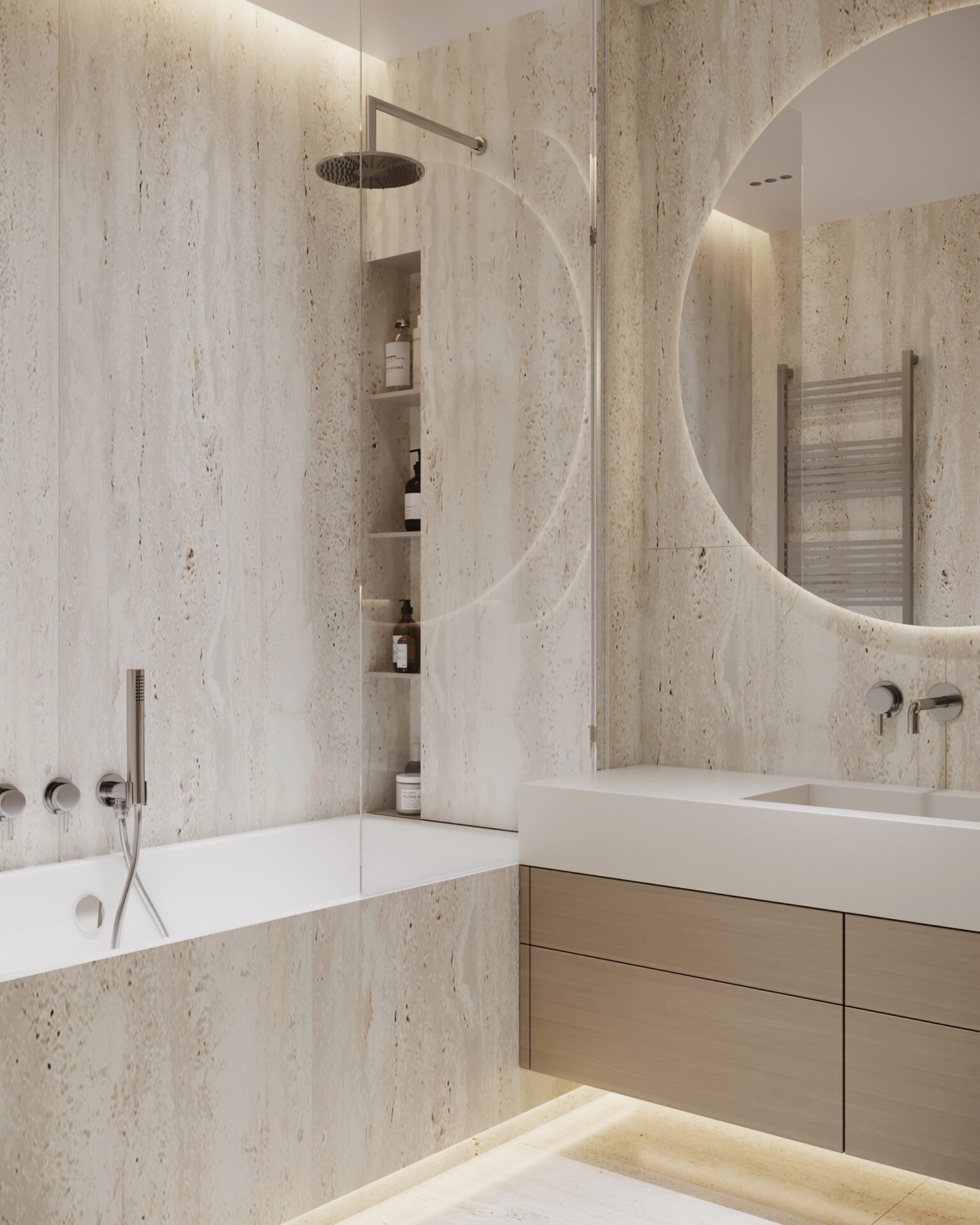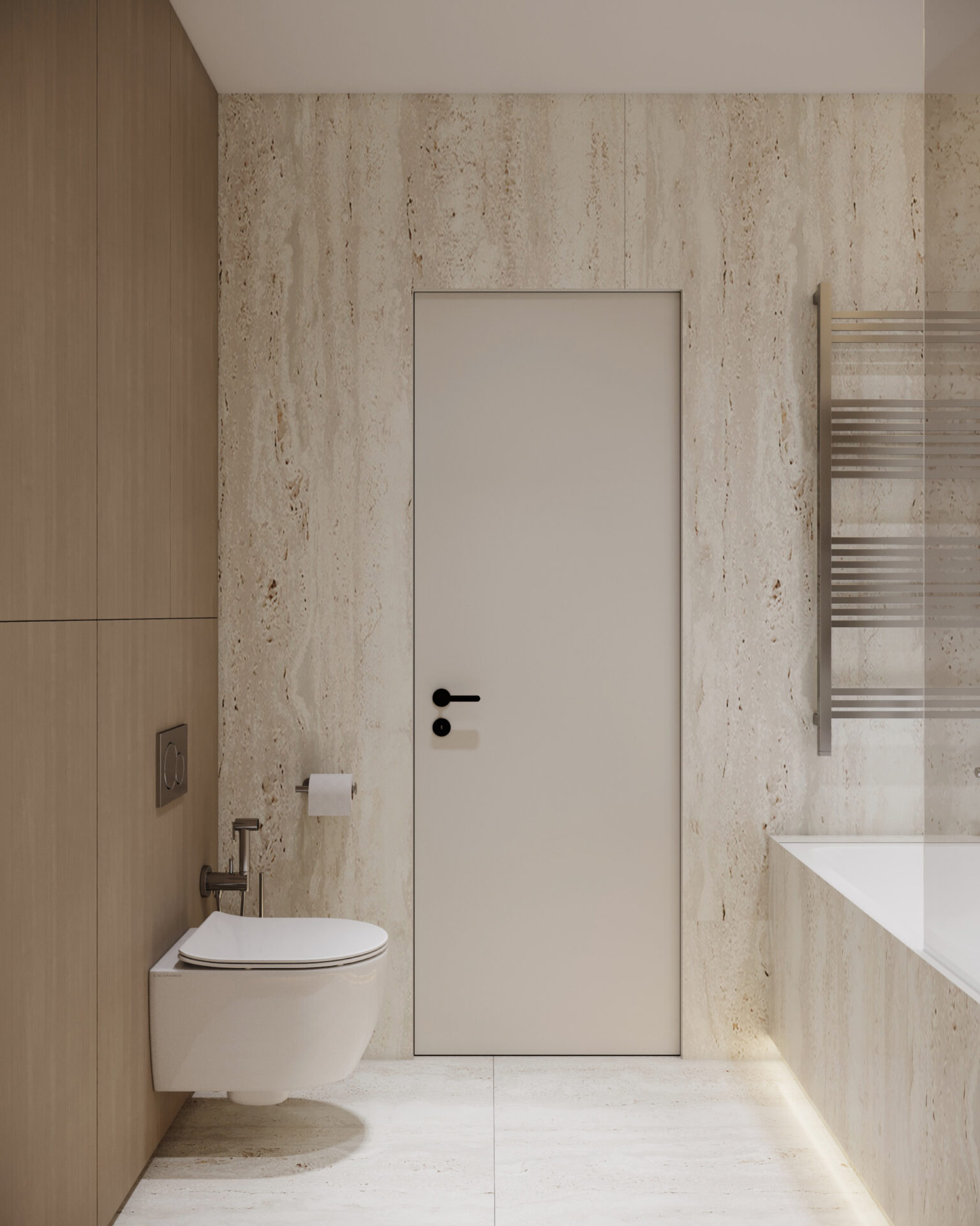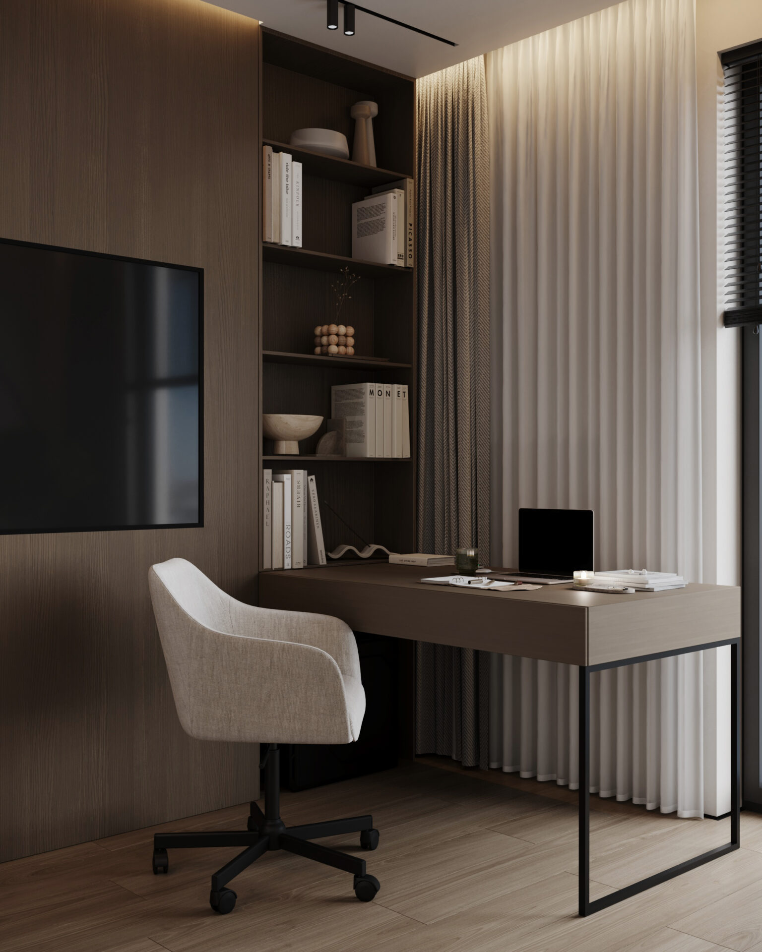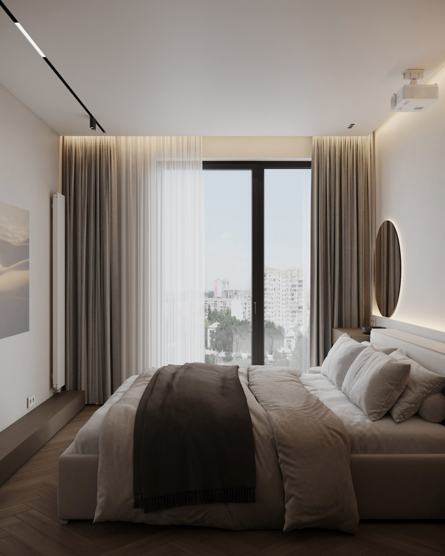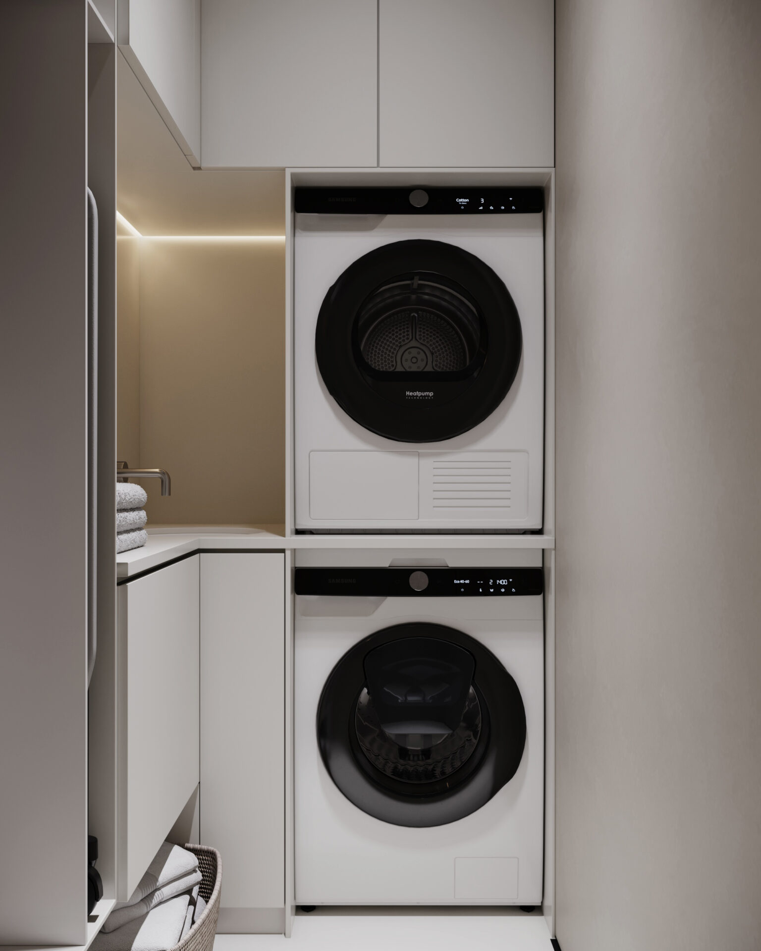 Проект для молодої дівчини, виконаний у мінімалістичному стилі. Ми поєднали світлі відтінки з деревом, створивши легкість і простір. Після перепланування у квартирі нам вдалося розмістити пральну кімнату, кабінет з гардеробною, спальню з проектором та винну шафу під обіднім столом у кухні. Комфорт та функціональність для сучасного життя.
