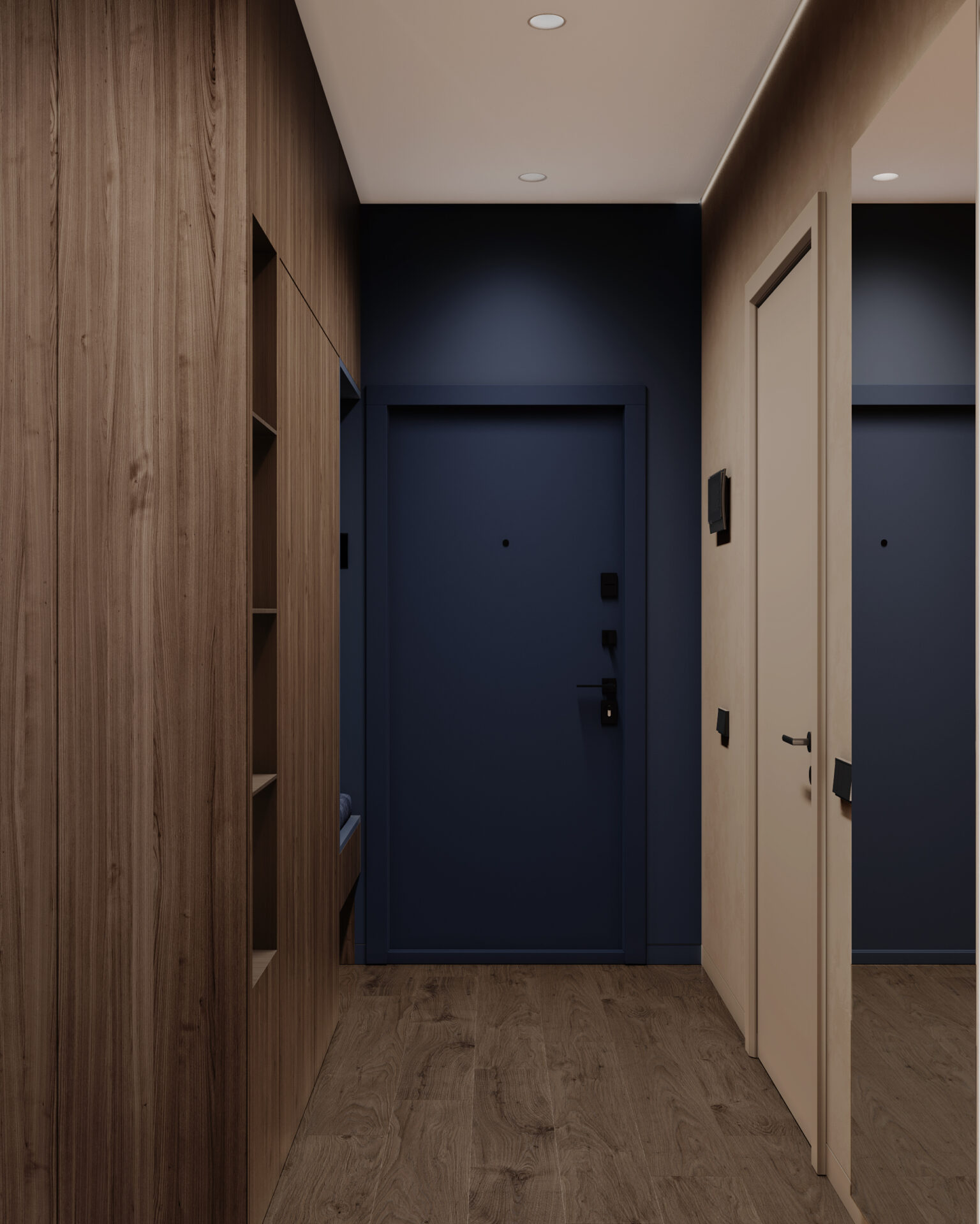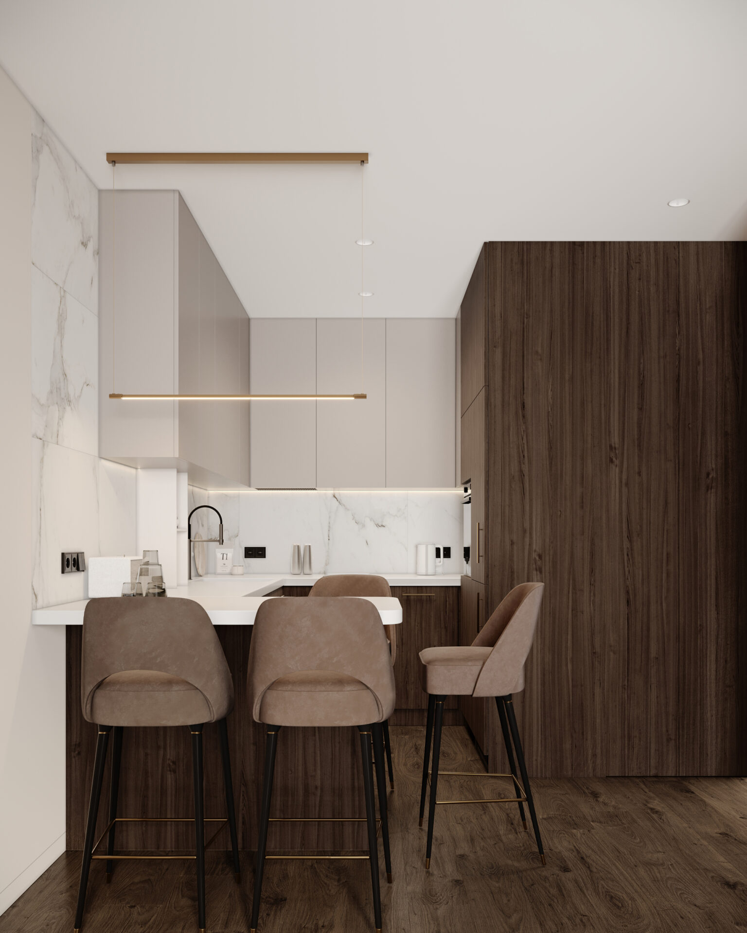 Типова функціональна однокімнатна квартира з акцентом на можливості працювати з дому, про що свідчать дві окремі робочі зони у кухні-вітальні та спальні. Традиційно для невеликих площ тут передбачено багато місць для зберігання, а також багатофункціональні рішення, такі як розкладний диван, або консоль-трансформер.